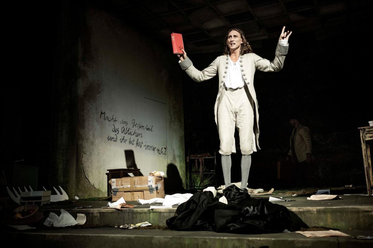 > Der Erzählfaden folgt Rousseaus Biographie, wie er sie in den "Bekenntnissen" geschildert hat. Diese Anlage macht die Sache natürlich nicht zum Stück, sondern bloss zum szenischen Wikipedia-Eintrag. Während aber die Internet-Darstellung die Er-Form verwendet, stellt das Theater einen Schauspieler auf die Bretter, der "Ich" sagt: "Ich Rousseau stehe vor euch Zuschauern und schlingere wie ein Irrwisch zwischen den Zeiten hin und her; den Zeiten meiner Vergangenheit, meiner Erzählgegenwart und unserer gerade entstehenden Aufführung. Demzufolge spiele ich euch jetzt einzelne Szenen vor, andere rapportiere ich, wieder andere kommentiere und reflektiere ich. Dazu hilft mir das Theater mit zwei weiteren Mitspielern. Und mit Musik, Bewegung, Kostümen, Perücken, Schminke und Beleuchtung." Soweit, so gut. Doch wird das Ganze dadurch spannender als das Buch? Oder die rororo-Biographie? Oder der Wikipedia-Eintrag? Nein? Das ist jetzt aber komisch. Was lief denn da falsch? <