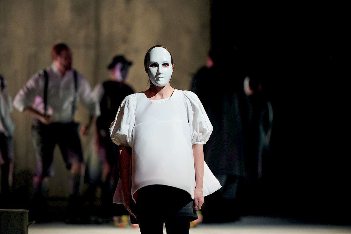 Regisseurin Eva-Maria Höckmayr inszeniert die "Tragödie aus dem mährischen Landleben" grundsätzlich zurückhaltend. Sie stellt einfach die Figuren, manchmal umgeben von stummen Gruppen, in den Raum und lässt sie singen wie in einem halbszenischen Oratorium. Da sind die Interaktionen natürlich recht rudimentär. Die beiden grossen Frauen, die Jenufa und die Küsterin verkörpern, können sich selber helfen und erfüllen dank ihrer Ausstrahlung, ihres Spiels und ihres Gesangs das Profil der Rolle. Die Männer sind darstellerisch steif und unbeholfen. Im Minimalkonzept der Regisseurin aber wirkt dann jede falsche Gebärde nicht nur deplaziert, sondern peinlich. - Und falsche Gebärden passieren auch ihr: Verschiebung von Podien nach hinten und vorn und am Höhepunkt (Entdeckung des Säuglingsmords) gar nach oben (Ausstattung Julia Rösler), dann Wechsel ins Stimmungslicht (Christian Aufderstroth) wie bei Lehár im Maxim, Gefuchtel des betrunkenen Steva mit dem Flachmann und torkelndes Umfallen wie bei der Liebhaberbühne, und dazu immer wieder "Maske auf! Maske ab!" wie bei Brechts Musterinszenierungen am Berliner Ensemble. Kurz, alles was bei der Inszenierung weit hergeholt ist, ist weit hergeholt.