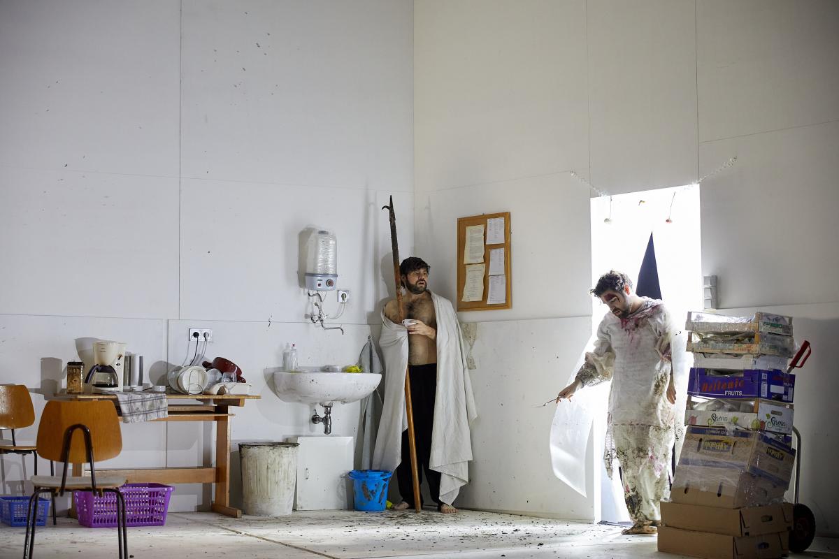 Der Raum ist breit, hat aber keine Tiefe. Er lässt sich symbolisch lesen. Basrelief: Die Figuren lösen sich nicht von der Fläche, bleiben dem allgemeinen Grund verhaftet. Bis zur Pause wird das Verharren auf der x-Achse immer bedrückender und weckt den Wunsch: "Wann öffnet sich endlich die Tiefe?" So gestaltet Alexander von Pfeil nicht nur die Aufführung, sondern auch die Empfindungslage der Zuschauer.