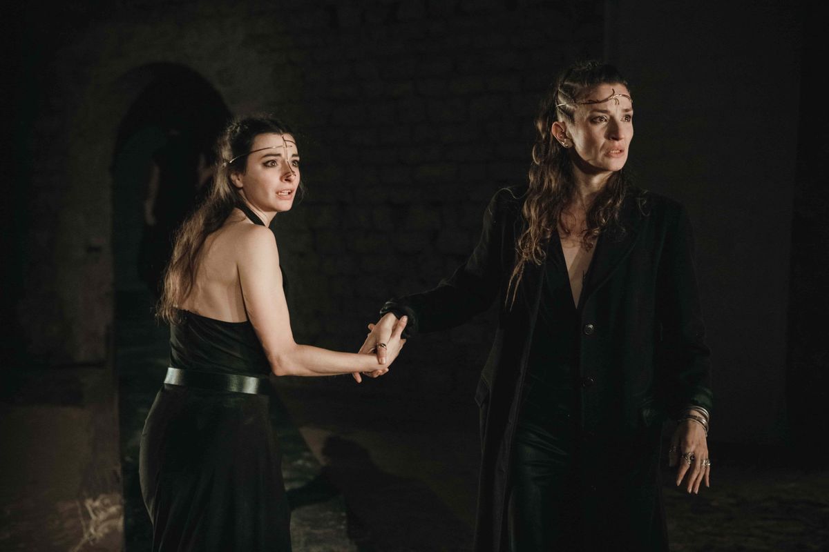 Die Dramenfiguren werden sensibel durch den Raum geführt und zu klassischen Konstellationen vereinigt. Die Schauspieler bewegen sich vor rohen, unbehauenen Quadersteinen; sie stehen hinter gewölbten Durchlässen und belauschen die Monologe der Hauptfiguren; beim Auftritt durch den Saal beziehen sie das Publikum in die Handlung ein, das damit – wie der antike Chor – die Funktion eines Zeugen annimmt.