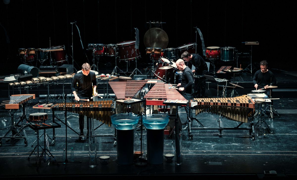 Mit geschlossenen Augen sehe ich die Störung nicht mehr. Aber auch nicht, wie sich die vier schwarzgewandeten Musiker durch die Landschaft bewegen. Die Bühne ist ja vollgestellt mit Perkussionsinstrumenten aller Art – aus Holz, Metall, Stein, Glas und Fell. Man kann mit ihnen nach dem Lehrbuch umgehen – links, rechts, links, rechts ... links, links, rechts, rechts – doch man kann auch frei mit Stöcken und Fingern auf Kanten und Schallkörper schlagen (Alexeji Gerassimez: Asventuras).