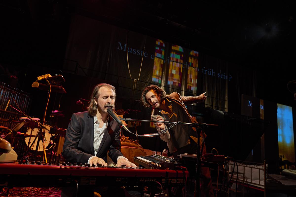 Wieder einmal ein Bühnenbild, das kein Bild ist, sondern eine Installation. Das ist jetzt allenthalben Mode. Die Spielorte verteilen sich über den ganzen Raum und werden durch die Scheinwerfer hervorgehoben, sobald sich ihnen die Handlung nähert. Durch den Kontext werden sie dann genauer bestimmt: Die beiden Tische sind Restauranttische. Die beiden weiblichen Figuren im Hintergrund sind Schwestern. Eine davon ist blind. Die Galerie, die die Bühne umfasst, wird zum Baugerüst, und, sehr kühn, die Musikerin, die im Quartett zuständig ist für Keyboards und Vocals, wird zur Kommissarin. So vermischen sich die Grenzen zwischen Begleitmusik und Handlung, aussen und innen, Wirklichkeit und Spiel. Plötzlich ruft die Blinde zwischen Vibraphon und Glockenspiel: "Ich finde mich nicht mehr zurecht. Holt mich hier raus!" Und der Leadsänger und Komponist Pär Hagström sitzt auf der andern Bühnenseite auf einem Stuhl und steigt als Vater Alberto in die Handlung ein.