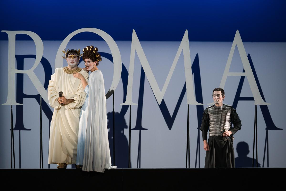 Bei geschlossenem Vorhang beginnt die Ouvertüre. Man merkt nach wenigen Takten, dass Mozart da noch nicht bei "Figaro" oder "Così" angekommen ist; nicht einmal bei "Idomeneo". Da wird der rote Samtstoff aber schon auseinandergezogen, und das Auge wird mobilisiert. Man blickt, fast wie bei den Brechtschen Schrifttafeln, auf die Buchstabenfolge ROMA. Damit ist ein Begriff gesetzt. Und eine Epoche. Und ein Ort. Man wartet nun, dass sich die Szene belebe. Aber nichts geschieht. Und nach einer Weile gleitet der Vorhang wieder zu. Das ist nun höchst irritierend. Technische Panne oder was? Warum bricht der Dirigent die Vorstellung nicht ab? Man wendet sich wieder der Musik zu. Aber mit dem Dösen ist es vorbei. Und da geht der Vorhang auch schon wieder auf. Jetzt sehen wir, wie auf den Fresken von Fellinis "Roma", einen römischen Imperator mit seiner Entourage in jener versteinerten Pose, in der sich diese Machtmenschen der Nachwelt überliefern wollten. Wenn der Vorhang zum dritten Mal auseinandergeht, zeigt das Auftreten von Besuchern in heutigen Kleidern an, dass sich die versteinerte römische Gesellschaft in einer Museumsvitrine befindet. In ihr werden sie in einem nächsten Bild von den Kuratoren für eine neue Aufstellung bereitgemacht, und in dieser neuen Aufstellung führen sie uns in Akt 1 der Oper.