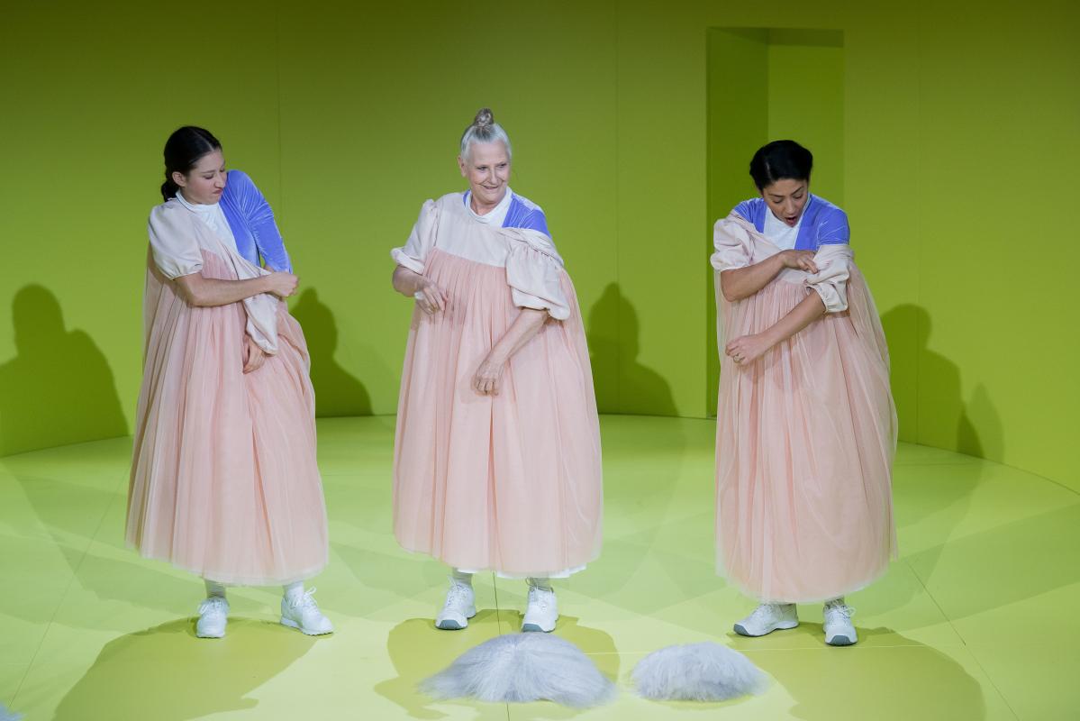 Auf der Bühne wird die Biographie der vereinigten Durchschnittsmenge mitteleuropäischer Ichs, in der sich die meisten Zuschauer wiederfinden, durch drei Frauen vorgetragen: Einer alten (Barbara Grimm), einer mittleren (Atina Tabé) und einer jungen (Tatjana Sebben). Dieses Mittel erlaubt es dem Verfasser, die Indentifikationsmöglichkeiten zu verdreifachen. Die Alte bringt die mütterlich-stützende, manchmal auch etwas danebenstehende Funktion ins Spiel. Die Mittlere das Energisch-Lebenszugewandte. Und die Junge die skeptisch-betrachtende, moralisch-wertende Dimension. Damit bieten die drei Frauen ein dynamisch-bewegtes Panorama von Seinsmöglichkeiten und Betrachtungsperspektiven an.